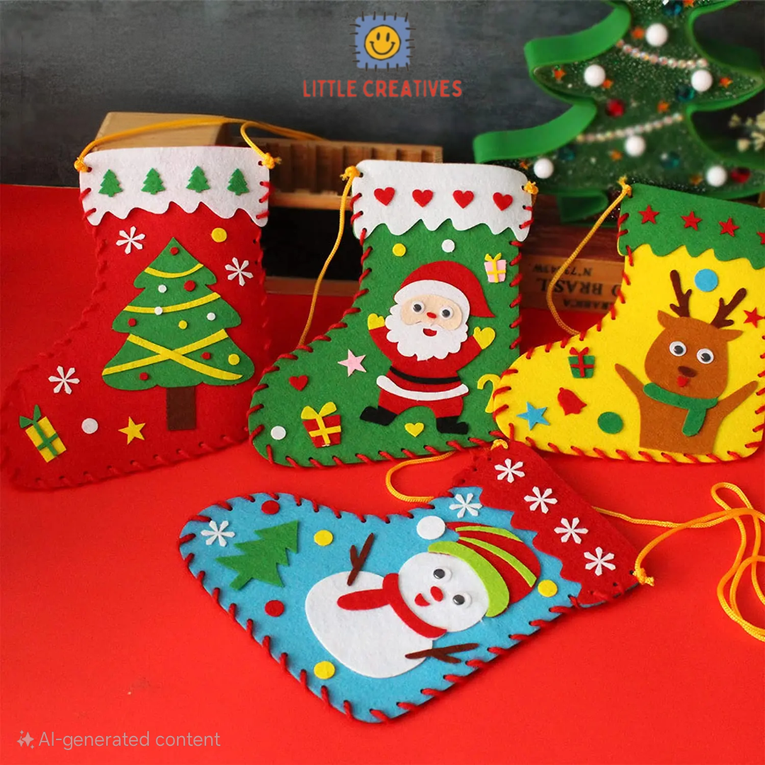 Each stocking is beautifully handcrafted from soft felt, featuring bright holiday characters β Santa Claus, a reindeer, a Christmas tree, and a snowman. With their playful colors and charming stitched details, these ornaments are perfect for toddlers and kids to decorate with safely.